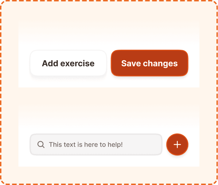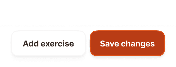 In Muba, footer actions appear in creation, editing, and browsing flows. The component supports two layout types: a button pair for save/submit flows ("Add exercise" + "Save changes"), and a search with add button for browsing flows where the user can filter a list and add new items simultaneously. Pinning the actions to the bottom ensures they are always within thumb reach on mobile, which matters when users are fatigued between sets.
