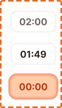 Timer shows the time in mm:ss format: "02:00", "01:49", "00:00". No hours. No milliseconds.